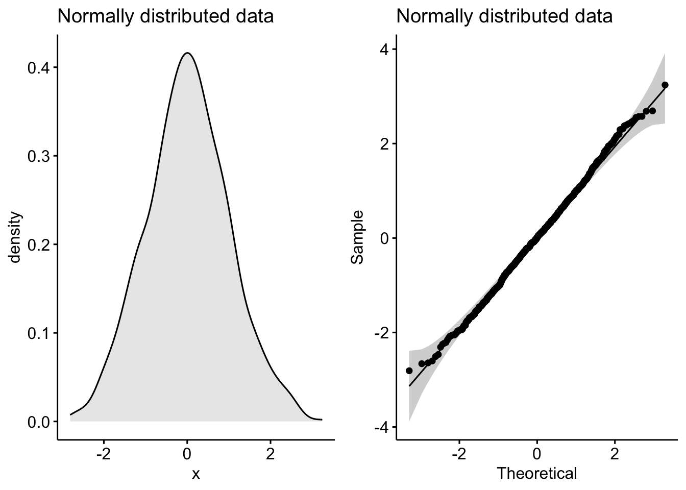 Notice the classic bell-shaped curve in the density plot and the nice straight line in the Q-Q plot?