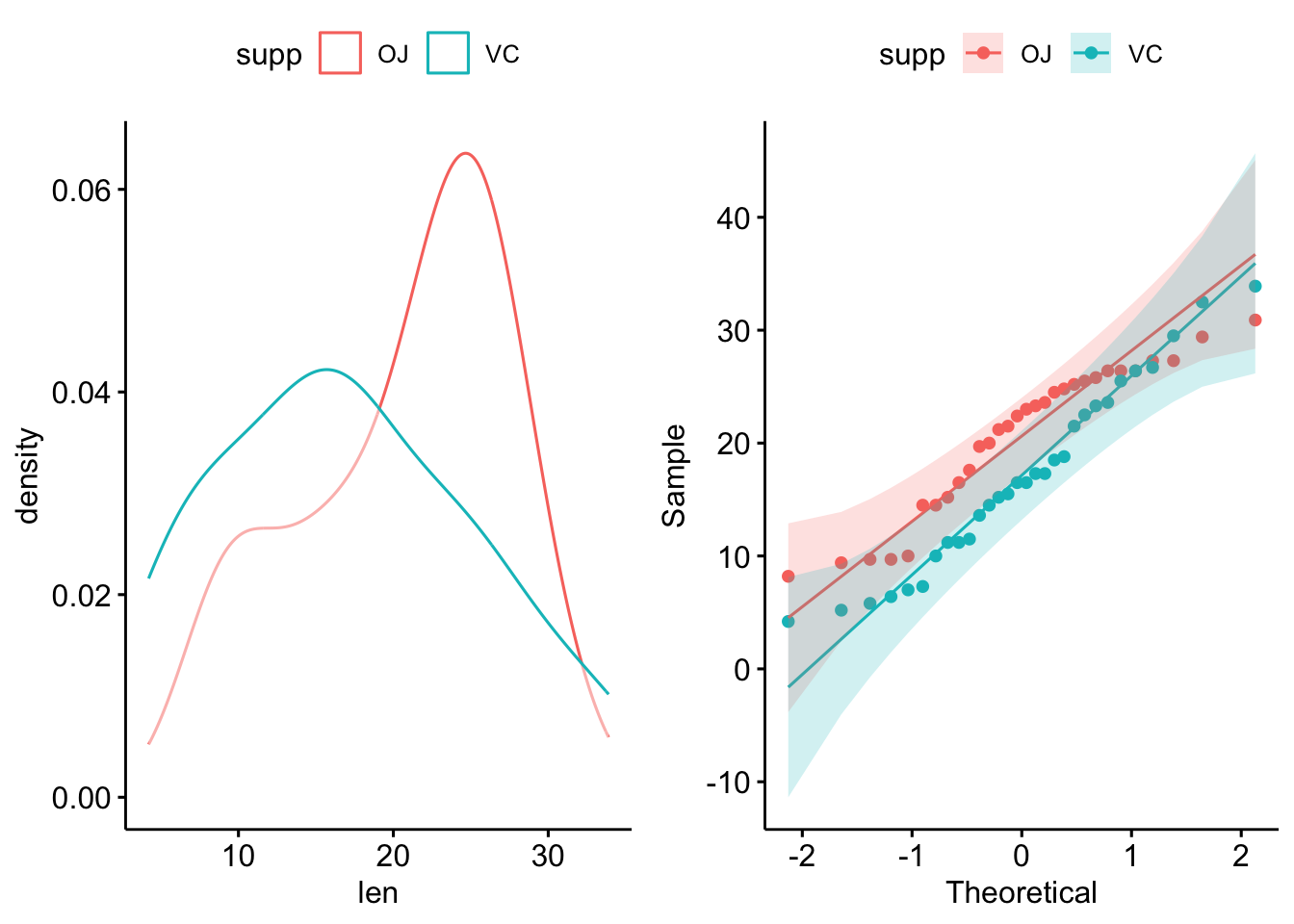 p2 <- ggqqplot(ToothGrowth, x = "len", color = "supp")