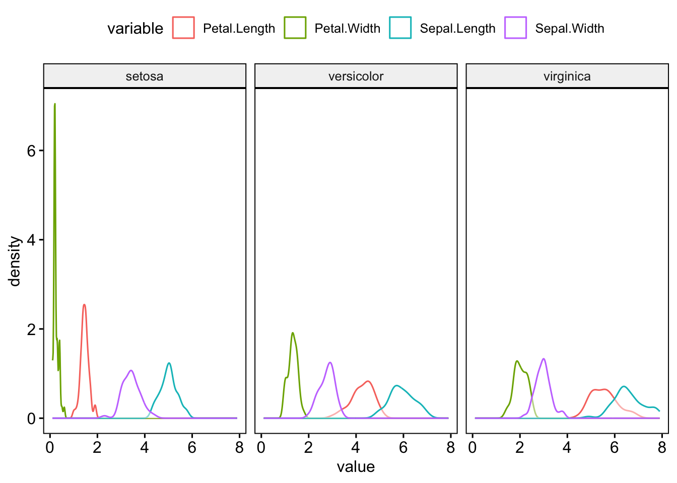 ggdensity(iris_long, x = "value", color = "variable", facet.by = "Species")