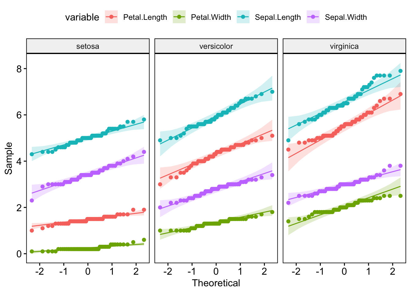 ggqqplot(iris_long, x = "value", color = "variable", facet.by = "Species")